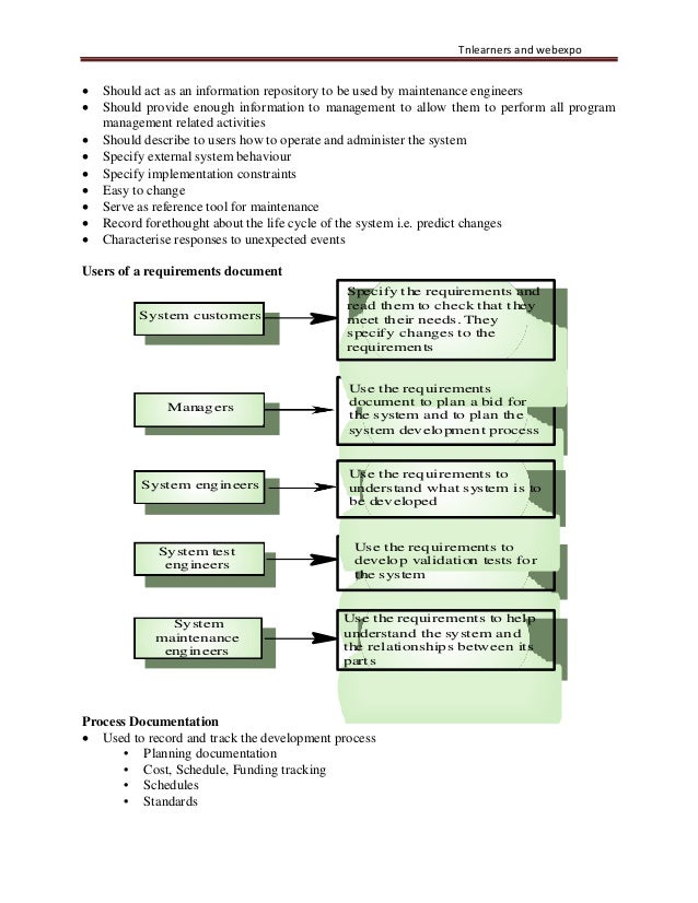14. 14. Tnlearners and webexpo • Should act as an information repository to be used by maintenance engineers • Should provide enough information to management to allow them to perform all program management related activities • Should describe to users how to operate and administer the system • Specify external system behaviour • Specify implementation constraints • Easy to change • Serve as reference tool for maintenance • Record forethought about the life cycle of the system i.e. predict changes • Characterise responses to unexpected events Users of a requirements document System customers Specify the requirements and read them to check that they meet their needs. They specify changes to the requirements Managers Use the requirements document to plan a bid for the system and to plan the system development process System engineers Use the requirements to understand what system is to be developed System test engineers Use the requirements to develop validation tests for the system System maintenance engineers Use the requirements to help understand the system and the relationships between its parts Process Documentation • Used to record and track the development process • Planning documentation • Cost, Schedule, Funding tracking • Schedules • Standards