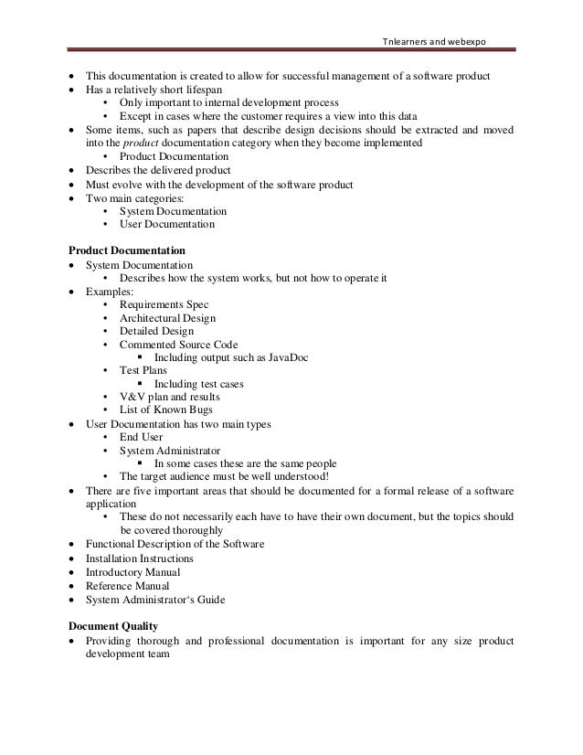15. 15. Tnlearners and webexpo • This documentation is created to allow for successful management of a software product • Has a relatively short lifespan • Only important to internal development process • Except in cases where the customer requires a view into this data • Some items, such as papers that describe design decisions should be extracted and moved into the product documentation category when they become implemented • Product Documentation • Describes the delivered product • Must evolve with the development of the software product • Two main categories: • System Documentation • User Documentation Product Documentation • System Documentation • Describes how the system works, but not how to operate it • Examples: • Requirements Spec • Architectural Design • Detailed Design • Commented Source Code  Including output such as JavaDoc • Test Plans  Including test cases • V&V plan and results • List of Known Bugs • User Documentation has two main types • End User • System Administrator  In some cases these are the same people • The target audience must be well understood! • There are five important areas that should be documented for a formal release of a software application • These do not necessarily each have to have their own document, but the topics should be covered thoroughly • Functional Description of the Software • Installation Instructions • Introductory Manual • Reference Manual • System Administrator‘s Guide Document Quality • Providing thorough and professional documentation is important for any size product development team