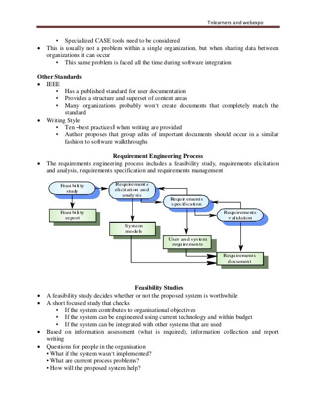 17. 17. Tnlearners and webexpo • Specialized CASE tools need to be considered • This is usually not a problem within a single organization, but when sharing data between organizations it can occur • This same problem is faced all the time during software integration Other Standards • IEEE • Has a published standard for user documentation • Provides a structure and superset of content areas • Many organizations probably won‘t create documents that completely match the standard • Writing Style • Ten ―best practices‖ when writing are provided • Author proposes that group edits of important documents should occur in a similar fashion to software walkthroughs Requirement Engineering Process • The requirements engineering process includes a feasibility study, requirements elicitation and analysis, requirements specification and requirements management Feasibility study Feasibility report Requirements elicitation and analysis System models Requir ements specification User and system requirements Requirements validation Requirements document Feasibility Studies • A feasibility study decides whether or not the proposed system is worthwhile • A short focused study that checks • If the system contributes to organisational objectives • If the system can be engineered using current technology and within budget • If the system can be integrated with other systems that are used • Based on information assessment (what is required), information collection and report writing • Questions for people in the organisation • What if the system wasn‘t implemented? • What are current process problems? • How will the proposed system help?