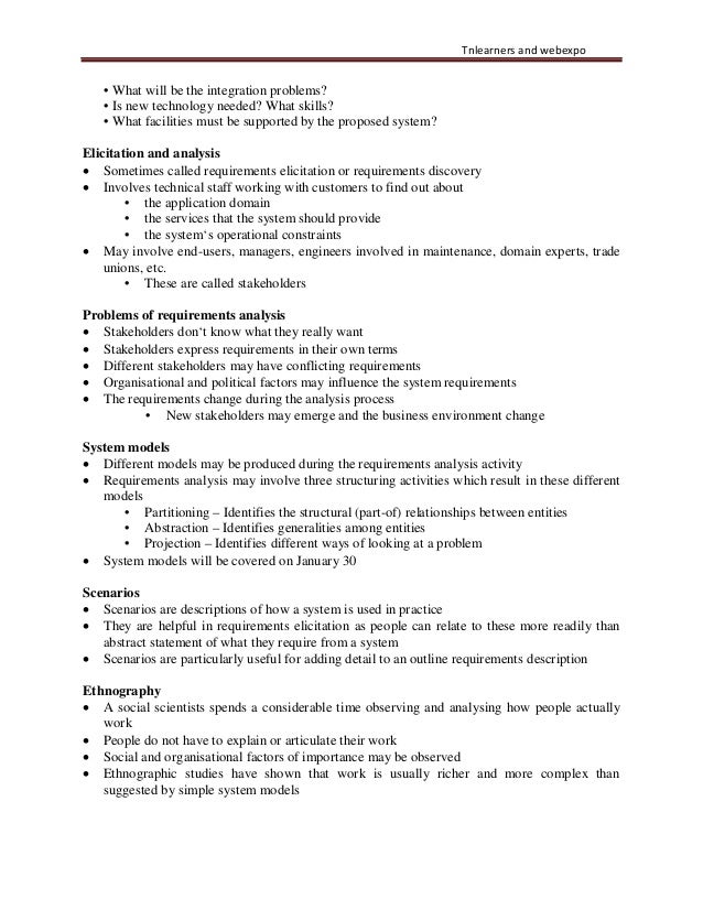 18. 18. Tnlearners and webexpo • What will be the integration problems? • Is new technology needed? What skills? • What facilities must be supported by the proposed system? Elicitation and analysis • Sometimes called requirements elicitation or requirements discovery • Involves technical staff working with customers to find out about • the application domain • the services that the system should provide • the system‘s operational constraints • May involve end-users, managers, engineers involved in maintenance, domain experts, trade unions, etc. • These are called stakeholders Problems of requirements analysis • Stakeholders don‘t know what they really want • Stakeholders express requirements in their own terms • Different stakeholders may have conflicting requirements • Organisational and political factors may influence the system requirements • The requirements change during the analysis process • New stakeholders may emerge and the business environment change System models • Different models may be produced during the requirements analysis activity • Requirements analysis may involve three structuring activities which result in these different models • Partitioning – Identifies the structural (part-of) relationships between entities • Abstraction – Identifies generalities among entities • Projection – Identifies different ways of looking at a problem • System models will be covered on January 30 Scenarios • Scenarios are descriptions of how a system is used in practice • They are helpful in requirements elicitation as people can relate to these more readily than abstract statement of what they require from a system • Scenarios are particularly useful for adding detail to an outline requirements description Ethnography • A social scientists spends a considerable time observing and analysing how people actually work • People do not have to explain or articulate their work • Social and organisational factors of importance may be observed • Ethnographic studies have shown that work is usually richer and more complex than suggested by simple system models