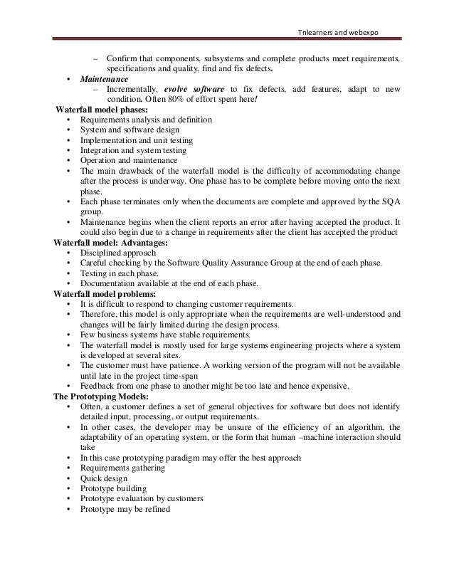 2. 2. Tnlearners and webexpo – Confirm that components, subsystems and complete products meet requirements, specifications and quality, find and fix defects. • Maintenance – Incrementally, evolve software to fix defects, add features, adapt to new condition. Often 80% of effort spent here! Waterfall model phases: • Requirements analysis and definition • System and software design • Implementation and unit testing • Integration and system testing • Operation and maintenance • The main drawback of the waterfall model is the difficulty of accommodating change after the process is underway. One phase has to be complete before moving onto the next phase. • Each phase terminates only when the documents are complete and approved by the SQA group. • Maintenance begins when the client reports an error after having accepted the product. It could also begin due to a change in requirements after the client has accepted the product Waterfall model: Advantages: • Disciplined approach • Careful checking by the Software Quality Assurance Group at the end of each phase. • Testing in each phase. • Documentation available at the end of each phase. Waterfall model problems: • It is difficult to respond to changing customer requirements. • Therefore, this model is only appropriate when the requirements are well-understood and changes will be fairly limited during the design process. • Few business systems have stable requirements. • The waterfall model is mostly used for large systems engineering projects where a system is developed at several sites. • The customer must have patience. A working version of the program will not be available until late in the project time-span • Feedback from one phase to another might be too late and hence expensive. The Prototyping Models: • Often, a customer defines a set of general objectives for software but does not identify detailed input, processing, or output requirements. • In other cases, the developer may be unsure of the efficiency of an algorithm, the adaptability of an operating system, or the form that human –machine interaction should take • In this case prototyping paradigm may offer the best approach • Requirements gathering • Quick design • Prototype building • Prototype evaluation by customers • Prototype may be refined