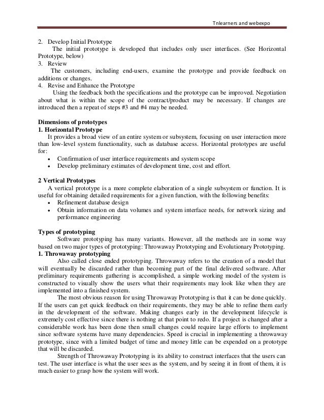 20. 20. Tnlearners and webexpo 2. Develop Initial Prototype The initial prototype is developed that includes only user interfaces. (See Horizontal Prototype, below) 3. Review The customers, including end-users, examine the prototype and provide feedback on additions or changes. 4. Revise and Enhance the Prototype Using the feedback both the specifications and the prototype can be improved. Negotiation about what is within the scope of the contract/product may be necessary. If changes are introduced then a repeat of steps #3 and #4 may be needed. Dimensions of prototypes 1. Horizontal Prototype It provides a broad view of an entire system or subsystem, focusing on user interaction more than low-level system functionality, such as database access. Horizontal prototypes are useful for: • Confirmation of user interface requirements and system scope • Develop preliminary estimates of development time, cost and effort. 2 Vertical Prototypes A vertical prototype is a more complete elaboration of a single subsystem or function. It is useful for obtaining detailed requirements for a given function, with the following benefits: • Refinement database design • Obtain information on data volumes and system interface needs, for network sizing and performance engineering Types of prototyping Software prototyping has many variants. However, all the methods are in some way based on two major types of prototyping: Throwaway Prototyping and Evolutionary Prototyping. 1. Throwaway prototyping Also called close ended prototyping. Throwaway refers to the creation of a model that will eventually be discarded rather than becoming part of the final delivered software. After preliminary requirements gathering is accomplished, a simple working model of the system is constructed to visually show the users what their requirements may look like when they are implemented into a finished system. The most obvious reason for using Throwaway Prototyping is that it can be done quickly. If the users can get quick feedback on their requirements, they may be able to refine them early in the development of the software. Making changes early in the development lifecycle is extremely cost effective since there is nothing at that point to redo. If a project is changed after a considerable work has been done then small changes could require large efforts to implement since software systems have many dependencies. Speed is crucial in implementing a throwaway prototype, since with a limited budget of time and money little can be expended on a prototype that will be discarded. Strength of Throwaway Prototyping is its ability to construct interfaces that the users can test. The user interface is what the user sees as the system, and by seeing it in front of them, it is much easier to grasp how the system will work.