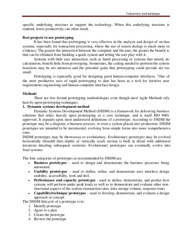 23. 23. Tnlearners and webexpo specific underlying structure to support the technology. When this underlying structure is omitted, lower productivity can often result. Best projects to use prototyping It has been found that prototyping is very effective in the analysis and design of on-line systems, especially for transaction processing, where the use of screen dialogs is much more in evidence. The greater the interaction between the computer and the user, the greater the benefit is that can be obtained from building a quick system and letting the user play with it. Systems with little user interaction, such as batch processing or systems that mostly do calculations, benefit little from prototyping. Sometimes, the coding needed to perform the system functions may be too intensive and the potential gains that prototyping could provide are too small. Prototyping is especially good for designing good human-computer interfaces. "One of the most productive uses of rapid prototyping to date has been as a tool for iterative user requirements engineering and human-computer interface design. Methods There are few formal prototyping methodologies even though most Agile Methods rely heavily upon prototyping techniques. 1. Dynamic systems development method Dynamic Systems Development Method (DSDM) is a framework for delivering business solutions that relies heavily upon prototyping as a core technique, and is itself ISO 9001 approved. It expands upon most understood definitions of a prototype. According to DSDM the prototype may be a diagram, a business process, or even a system placed into production. DSDM prototypes are intended to be incremental, evolving from simple forms into more comprehensive ones. DSDM prototypes may be throwaway or evolutionary. Evolutionary prototypes may be evolved horizontally (breadth then depth) or vertically (each section is built in detail with additional iterations detailing subsequent sections). Evolutionary prototypes can eventually evolve into final systems. The four categories of prototypes as recommended by DSDM are: • Business prototypes – used to design and demonstrate the business processes being automated. • Usability prototypes – used to define, refine, and demonstrate user interface design usability, accessibility, look and feel. • Performance and capacity prototypes - used to define, demonstrate, and predict how systems will perform under peak loads as well as to demonstrate and evaluate other non- functional aspects of the system (transaction rates, data storage volume, response time) • Capability/technique prototypes – used to develop, demonstrate, and evaluate a design approach or concept. The DSDM lifecycle of a prototype is to: 1. Identify prototype 2. Agree to a plan 3. Create the prototype 4. Review the prototype