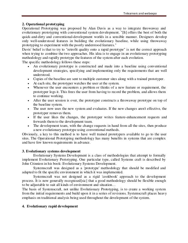 24. 24. Tnlearners and webexpo 2. Operational prototyping Operational Prototyping was proposed by Alan Davis as a way to integrate throwaway and evolutionary prototyping with conventional system development. "[It] offers the best of both the quick-and-dirty and conventional-development worlds in a sensible manner. Designers develop only well-understood features in building the evolutionary baseline, while using throwaway prototyping to experiment with the poorly understood features." Davis' belief is that to try to "retrofit quality onto a rapid prototype" is not the correct approach when trying to combine the two approaches. His idea is to engage in an evolutionary prototyping methodology and rapidly prototype the features of the system after each evolution. The specific methodology follows these steps: • An evolutionary prototype is constructed and made into a baseline using conventional development strategies, specifying and implementing only the requirements that are well understood. • Copies of the baseline are sent to multiple customer sites along with a trained prototyper. • At each site, the prototyper watches the user at the system. • Whenever the user encounters a problem or thinks of a new feature or requirement, the prototyper logs it. This frees the user from having to record the problem, and allows them to continue working. • After the user session is over, the prototyper constructs a throwaway prototype on top of the baseline system. • The user now uses the new system and evaluates. If the new changes aren't effective, the prototyper removes them. • If the user likes the changes, the prototyper writes feature-enhancement requests and forwards them to the development team. • The development team, with the change requests in hand from all the sites, then produce a new evolutionary prototype using conventional methods. Obviously, a key to this method is to have well trained prototypers available to go to the user sites. The Operational Prototyping methodology has many benefits in systems that are complex and have few known requirements in advance. 3. Evolutionary systems development Evolutionary Systems Development is a class of methodologies that attempt to formally implement Evolutionary Prototyping. One particular type, called Systems craft is described by John Crinnion in his book: Evolutionary Systems Development. Systemscraft was designed as a 'prototype' methodology that should be modified and adapted to fit the specific environment in which it was implemented. Systemscraft was not designed as a rigid 'cookbook' approach to the development process. It is now generally recognised[sic] that a good methodology should be flexible enough to be adjustable to suit all kinds of environment and situation… The basis of Systemscraft, not unlike Evolutionary Prototyping, is to create a working system from the initial requirements and build upon it in a series of revisions. Systemscraft places heavy emphasis on traditional analysis being used throughout the development of the system. 4. Evolutionary rapid development