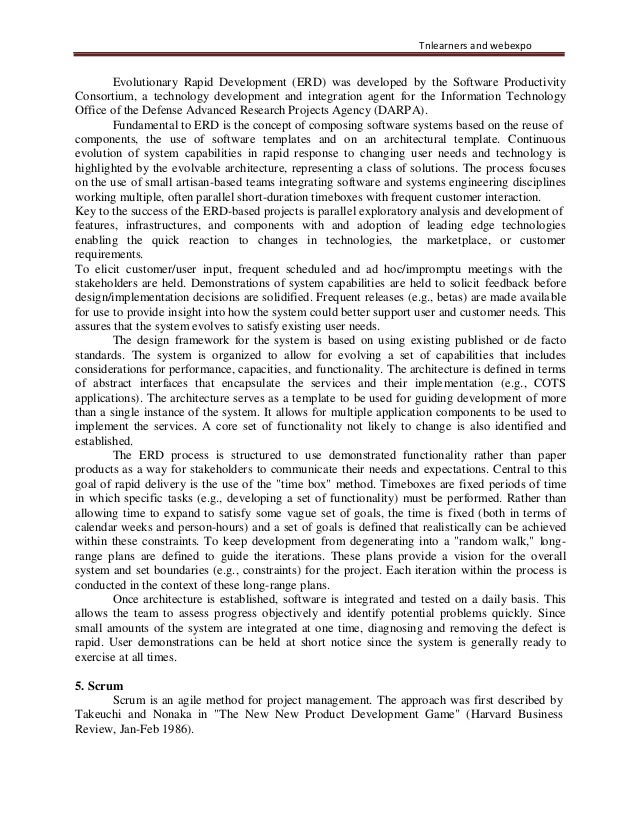 25. 25. Tnlearners and webexpo Evolutionary Rapid Development (ERD) was developed by the Software Productivity Consortium, a technology development and integration agent for the Information Technology Office of the Defense Advanced Research Projects Agency (DARPA). Fundamental to ERD is the concept of composing software systems based on the reuse of components, the use of software templates and on an architectural template. Continuous evolution of system capabilities in rapid response to changing user needs and technology is highlighted by the evolvable architecture, representing a class of solutions. The process focuses on the use of small artisan-based teams integrating software and systems engineering disciplines working multiple, often parallel short-duration timeboxes with frequent customer interaction. Key to the success of the ERD-based projects is parallel exploratory analysis and development of features, infrastructures, and components with and adoption of leading edge technologies enabling the quick reaction to changes in technologies, the marketplace, or customer requirements. To elicit customer/user input, frequent scheduled and ad hoc/impromptu meetings with the stakeholders are held. Demonstrations of system capabilities are held to solicit feedback before design/implementation decisions are solidified. Frequent releases (e.g., betas) are made available for use to provide insight into how the system could better support user and customer needs. This assures that the system evolves to satisfy existing user needs. The design framework for the system is based on using existing published or de facto standards. The system is organized to allow for evolving a set of capabilities that includes considerations for performance, capacities, and functionality. The architecture is defined in terms of abstract interfaces that encapsulate the services and their implementation (e.g., COTS applications). The architecture serves as a template to be used for guiding development of more than a single instance of the system. It allows for multiple application components to be used to implement the services. A core set of functionality not likely to change is also identified and established. The ERD process is structured to use demonstrated functionality rather than paper products as a way for stakeholders to communicate their needs and expectations. Central to this goal of rapid delivery is the use of the "time box" method. Timeboxes are fixed periods of time in which specific tasks (e.g., developing a set of functionality) must be performed. Rather than allowing time to expand to satisfy some vague set of goals, the time is fixed (both in terms of calendar weeks and person-hours) and a set of goals is defined that realistically can be achieved within these constraints. To keep development from degenerating into a "random walk," long- range plans are defined to guide the iterations. These plans provide a vision for the overall system and set boundaries (e.g., constraints) for the project. Each iteration within the process is conducted in the context of these long-range plans. Once architecture is established, software is integrated and tested on a daily basis. This allows the team to assess progress objectively and identify potential problems quickly. Since small amounts of the system are integrated at one time, diagnosing and removing the defect is rapid. User demonstrations can be held at short notice since the system is generally ready to exercise at all times. 5. Scrum Scrum is an agile method for project management. The approach was first described by Takeuchi and Nonaka in "The New New Product Development Game" (Harvard Business Review, Jan-Feb 1986).