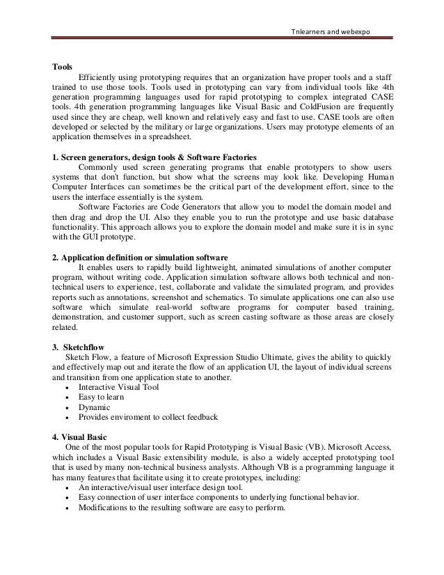 26. 26. Tnlearners and webexpo Tools Efficiently using prototyping requires that an organization have proper tools and a staff trained to use those tools. Tools used in prototyping can vary from individual tools like 4th generation programming languages used for rapid prototyping to complex integrated CASE tools. 4th generation programming languages like Visual Basic and ColdFusion are frequently used since they are cheap, well known and relatively easy and fast to use. CASE tools are often developed or selected by the military or large organizations. Users may prototype elements of an application themselves in a spreadsheet. 1. Screen generators, design tools & Software Factories Commonly used screen generating programs that enable prototypers to show users systems that don't function, but show what the screens may look like. Developing Human Computer Interfaces can sometimes be the critical part of the development effort, since to the users the interface essentially is the system. Software Factories are Code Generators that allow you to model the domain model and then drag and drop the UI. Also they enable you to run the prototype and use basic database functionality. This approach allows you to explore the domain model and make sure it is in sync with the GUI prototype. 2. Application definition or simulation software It enables users to rapidly build lightweight, animated simulations of another computer program, without writing code. Application simulation software allows both technical and non- technical users to experience, test, collaborate and validate the simulated program, and provides reports such as annotations, screenshot and schematics. To simulate applications one can also use software which simulate real-world software programs for computer based training, demonstration, and customer support, such as screen casting software as those areas are closely related. 3. Sketchflow Sketch Flow, a feature of Microsoft Expression Studio Ultimate, gives the ability to quickly and effectively map out and iterate the flow of an application UI, the layout of individual screens and transition from one application state to another. • Interactive Visual Tool • Easy to learn • Dynamic • Provides enviroment to collect feedback 4. Visual Basic One of the most popular tools for Rapid Prototyping is Visual Basic (VB). Microsoft Access, which includes a Visual Basic extensibility module, is also a widely accepted prototyping tool that is used by many non-technical business analysts. Although VB is a programming language it has many features that facilitate using it to create prototypes, including: • An interactive/visual user interface design tool. • Easy connection of user interface components to underlying functional behavior. • Modifications to the resulting software are easy to perform.