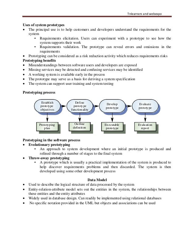 28. 28. Tnlearners and webexpo Uses of system prototypes • The principal use is to help customers and developers understand the requirements for the system • Requirements elicitation. Users can experiment with a prototype to see how the system supports their work • Requirements validation. The prototype can reveal errors and omissions in the requirements • Prototyping can be considered as a risk reduction activity which reduces requirements risks Prototyping benefits • Misunderstandings between software users and developers are exposed • Missing services may be detected and confusing services may be identified • A working system is available early in the process • The prototype may serve as a basis for deriving a system specification • The system can support user training and system testing Prototyping process Establish prototype objectives Define prototype functionality Develop prototype Evaluate prototype Prototyping plan Outline definition Executable prototype Evaluation report Prototyping in the software process • Evolutionary prototyping • An approach to system development where an initial prototype is produced and refined through a number of stages to the final system • Throw-away prototyping • A prototype which is usually a practical implementation of the system is produced to help discover requirements problems and then discarded. The system is then developed using some other development process Data Model • Used to describe the logical structure of data processed by the system • Entity-relation-attribute model sets out the entities in the system, the relationships between these entities and the entity attributes • Widely used in database design. Can readily be implemented using relational databases • No specific notation provided in the UML but objects and associations can be used