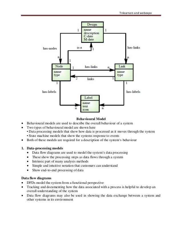 29. 29. Tnlearners and webexpo Behavioural Model • Behavioural models are used to describe the overall behaviour of a system • Two types of behavioural model are shown here • Data processing models that show how data is processed as it moves through the system • State machine models that show the systems response to events • Both of these models are required for a description of the system‘s behaviour 1. Data-processing models • Data flow diagrams are used to model the system‘s data processing • These show the processing steps as data flows through a system • Intrinsic part of many analysis methods • Simple and intuitive notation that customers can understand • Show end-to-end processing of data Data flow diagrams • DFDs model the system from a functional perspective • Tracking and documenting how the data associated with a process is helpful to develop an overall understanding of the system • Data flow diagrams may also be used in showing the data exchange between a system and other systems in its environment