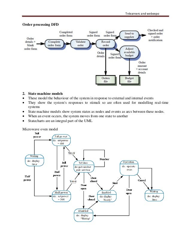 30. 30. Tnlearners and webexpo Order processing DFD 2. State machine models • These model the behaviour of the system in response to external and internal events • They show the system‘s responses to stimuli so are often used for modelling real-time systems • State machine models show system states as nodes and events as arcs between these nodes. • When an event occurs, the system moves from one state to another • Statecharts are an integral part of the UML Microwave oven model
