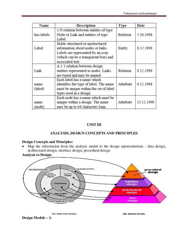 33. 33. Tnlearners and webexpo UNIT III ANALYSIS, DESIGN CONCEPTS AND PRINCIPLES Design Concepts and Principles: • Map the information from the analysis model to the design representations - data design, architectural design, interface design, procedural design Analysis to Design: Design Models – 1: