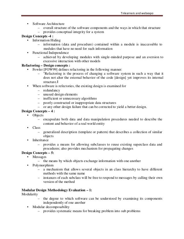 35. 35. Tnlearners and webexpo • Software Architecture – overall structure of the software components and the ways in which that structure – provides conceptual integrity for a system Design Concepts -4 : • Information Hiding – information (data and procedure) contained within a module is inaccessible to modules that have no need for such information • Functional Independence – achieved by developing modules with single-minded purpose and an aversion to excessive interaction with other models Refactoring – Design concepts : • Fowler [FOW99] defines refactoring in the following manner: – "Refactoring is the process of changing a software system in such a way that it does not alter the external behavior of the code [design] yet improves its internal structure.‖ • When software is refectories, the existing design is examined for – redundancy – unused design elements – inefficient or unnecessary algorithms – poorly constructed or inappropriate data structures – or any other design failure that can be corrected to yield a better design. Design Concepts – 4 : • Objects – encapsulate both data and data manipulation procedures needed to describe the content and behavior of a real world entity • Class – generalized description (template or pattern) that describes a collection of similar objects • Inheritance – provides a means for allowing subclasses to reuse existing superclass data and procedures; also provides mechanism for propagating changes Design Concepts – 5: • Messages – the means by which objects exchange information with one another • Polymorphism – a mechanism that allows several objects in an class hierarchy to have different methods with the same name – instances of each subclass will be free to respond to messages by calling their own version of the method Modular Design Methodology Evaluation – 1: Modularity – the degree to which software can be understood by examining its components independently of one another • Modular decomposability – provides systematic means for breaking problem into sub problems