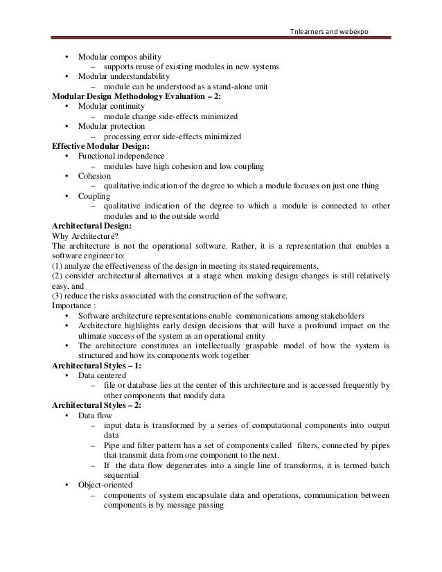 36. 36. Tnlearners and webexpo • Modular compos ability – supports reuse of existing modules in new systems • Modular understandability – module can be understood as a stand-alone unit Modular Design Methodology Evaluation – 2: • Modular continuity – module change side-effects minimized • Modular protection – processing error side-effects minimized Effective Modular Design: • Functional independence – modules have high cohesion and low coupling • Cohesion – qualitative indication of the degree to which a module focuses on just one thing • Coupling – qualitative indication of the degree to which a module is connected to other modules and to the outside world Architectural Design: Why Architecture? The architecture is not the operational software. Rather, it is a representation that enables a software engineer to: (1) analyze the effectiveness of the design in meeting its stated requirements, (2) consider architectural alternatives at a stage when making design changes is still relatively easy, and (3) reduce the risks associated with the construction of the software. Importance : • Software architecture representations enable communications among stakeholders • Architecture highlights early design decisions that will have a profound impact on the ultimate success of the system as an operational entity • The architecture constitutes an intellectually graspable model of how the system is structured and how its components work together Architectural Styles – 1: • Data centered – file or database lies at the center of this architecture and is accessed frequently by other components that modify data Architectural Styles – 2: • Data flow – input data is transformed by a series of computational components into output data – Pipe and filter pattern has a set of components called filters, connected by pipes that transmit data from one component to the next. – If the data flow degenerates into a single line of transforms, it is termed batch sequential • Object-oriented – components of system encapsulate data and operations, communication between components is by message passing