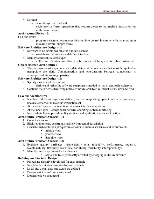 37. 37. Tnlearners and webexpo • Layered – several layers are defined – each layer performs operations that become closer to the machine instruction set in the lower layers Architectural Styles – 3: Call and return – program structure decomposes function into control hierarchy with main program invoking several subprograms Software Architecture Design – 1: • Software to be developed must be put into context – model external entities and define interfaces • Identify architectural archetypes – collection of abstractions that must be modeled if the system is to be constructed Object oriented Architecture : • The components of a system encapsulate data and the operations that must be applied to manipulate the data. Communication and coordination between components is accomplished via message passing Software Architecture Design – 2: • Specify structure of the system – define and refine the software components needed to implement each archetype • Continue the process iteratively until a complete architectural structure has been derived Layered Architecture: • Number of different layers are defined, each accomplishing operations that progressively become closer to the machine instruction set • At the outer layer –components service user interface operations. • At the inner layer – components perform operating system interfacing. • Intermediate layers provide utility services and application software function Architecture Tradeoff Analysis – 1: 1. Collect scenarios 2. Elicit requirements, constraints, and environmental description 3. Describe architectural styles/patterns chosen to address scenarios and requirements • module view • process view • data flow view Architecture Tradeoff Analysis – 2: 4. Evaluate quality attributes independently (e.g. reliability, performance, security, maintainability, flexibility, testability, portability, reusability, interoperability) 5. Identify sensitivity points for architecture • any attributes significantly affected by changing in the architecture Refining Architectural Design: • Processing narrative developed for each module • Interface description provided for each module • Local and global data structures are defined • Design restrictions/limitations noted • Design reviews conducted
