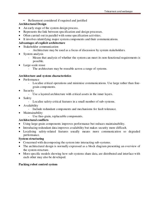 38. 38. Tnlearners and webexpo • Refinement considered if required and justified Architectural Design • An early stage of the system design process. • Represents the link between specification and design processes. • Often carried out in parallel with some specification activities. • It involves identifying major system components and their communications. Advantages of explicit architecture • Stakeholder communication - Architecture may be used as a focus of discussion by system stakeholders. • System analysis - Means that analysis of whether the system can meet its non-functional requirements is possible. • Large-scale reuse - The architecture may be reusable across a range of systems. Architecture and system characteristics • Performance - Localise critical operations and minimise communications. Use large rather than fine- grain components. • Security - Use a layered architecture with critical assets in the inner layers. • Safety - Localise safety-critical features in a small number of sub-systems. • Availability - Include redundant components and mechanisms for fault tolerance. • Maintainability - Use fine-grain, replaceable components. Architectural conflicts • Using large-grain components improves performance but reduces maintainability. • Introducing redundant data improves availability but makes security more difficult. • Localising safety-related features usually means more communication so degraded performance. System structuring • Concerned with decomposing the system into interacting sub-systems. • The architectural design is normally expressed as a block diagram presenting an overview of the system structure. • More specific models showing how sub-systems share data, are distributed and interface with each other may also be developed. Packing robot control system