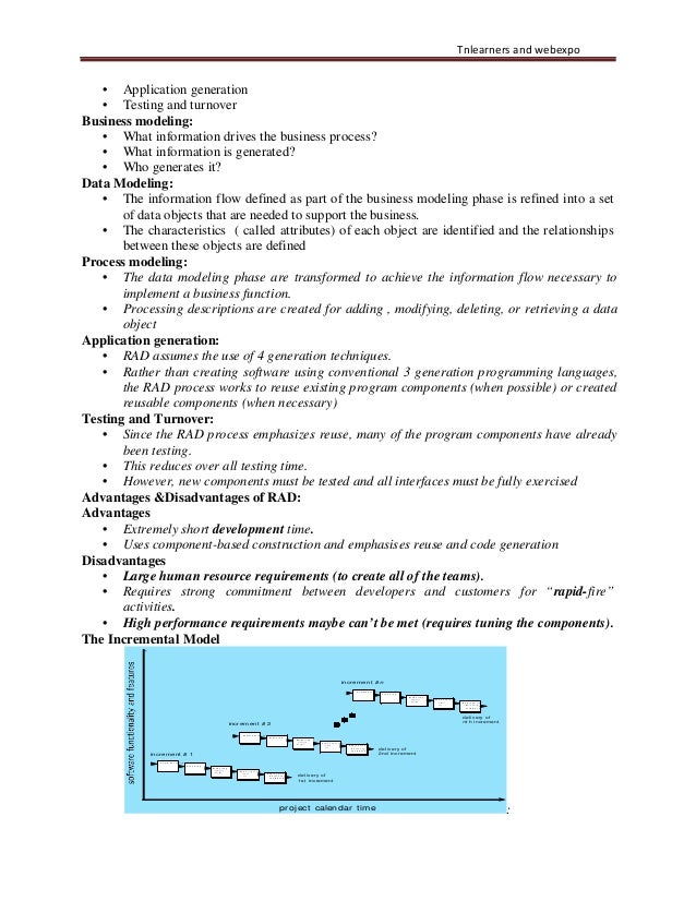 3. 3. Tnlearners and webexpo • Prototype thrown away and software developed using formal process{ it is used to define the requirement} Prototyping Strengths: • Requirements can be set earlier and more reliably • Customer sees results very quickly. • Customer is educated in what is possible helping to refine requirements. • Requirements can be communicated more clearly and completely • Between developers and clients Requirements and design options can be investigated quickly and Cheaply Weaknesses: – Requires a rapid prototyping tool and expertise in using it–a cost for the development organisation – Smoke and mirrors - looks like a working version, but it is not. The RAD Model: • Rapid Application Development is a linear sequential software development process model that emphasizes an extremely short development cycle • Rapid application achieved by using a component based construction approach • If requirements are well understood and project scope is constrained the RAD process enables a development team to create a ―fully functional system‖ Team # n M o d e lin g business m odeling data m odeling process m odeling Communicat ion Planning Team # 2 Modeling business m odeling dat a m odeling process m odeling Co n st ru ct io n com ponent reuse autom atic code generation testing Team # 1 Modeling business modeling dat a modeling process modeling Const ruct ion com ponent reuse aut om at ic code generat ion t est ing Deployment int egrat ion delivery feedback Const ruct ion component reuse aut omat ic code generat ion t est ing 60 - 90 days RAD phases : • Business modeling • Data modeling • Process modeling