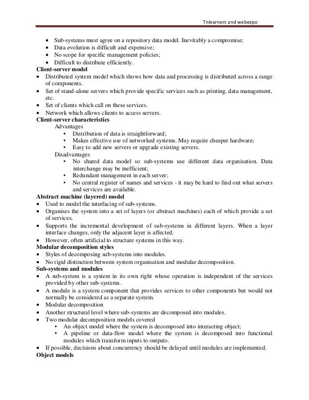 41. 41. Tnlearners and webexpo • Sub-systems must agree on a repository data model. Inevitably a compromise; • Data evolution is difficult and expensive; • No scope for specific management policies; • Difficult to distribute efficiently. Client-server model • Distributed system model which shows how data and processing is distributed across a range of components. • Set of stand-alone servers which provide specific services such as printing, data management, etc. • Set of clients which call on these services. • Network which allows clients to access servers. Client-server characteristics Advantages • Distribution of data is straightforward; • Makes effective use of networked systems. May require cheaper hardware; • Easy to add new servers or upgrade existing servers. Disadvantages • No shared data model so sub-systems use different data organisation. Data interchange may be inefficient; • Redundant management in each server; • No central register of names and services - it may be hard to find out what servers and services are available. Abstract machine (layered) model • Used to model the interfacing of sub-systems. • Organises the system into a set of layers (or abstract machines) each of which provide a set of services. • Supports the incremental development of sub-systems in different layers. When a layer interface changes, only the adjacent layer is affected. • However, often artificial to structure systems in this way. Modular decomposition styles • Styles of decomposing sub-systems into modules. • No rigid distinction between system organisation and modular decomposition. Sub-systems and modules • A sub-system is a system in its own right whose operation is independent of the services provided by other sub-systems. • A module is a system component that provides services to other components but would not normally be considered as a separate system. • Modular decomposition • Another structural level where sub-systems are decomposed into modules. • Two modular decomposition models covered • An object model where the system is decomposed into interacting object; • A pipeline or data-flow model where the system is decomposed into functional modules which transform inputs to outputs. • If possible, decisions about concurrency should be delayed until modules are implemented. Object models