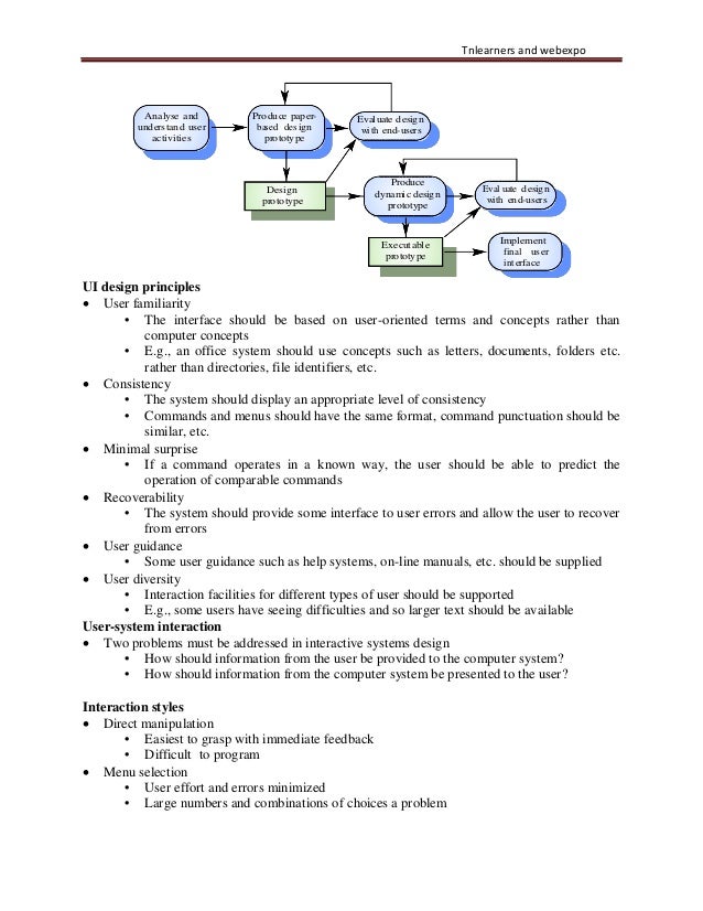 43. 43. Tnlearners and webexpo Analyse and understand user activities Produce paper- based des ign prototype Evaluate design wi th end-users Design prototype Produce dynamic design prototype Eval uate design with end-users UI design principles • User familiarity Executable prototype Implement final user int erface • The interface should be based on user-oriented terms and concepts rather than computer concepts • E.g., an office system should use concepts such as letters, documents, folders etc. rather than directories, file identifiers, etc. • Consistency • The system should display an appropriate level of consistency • Commands and menus should have the same format, command punctuation should be similar, etc. • Minimal surprise • If a command operates in a known way, the user should be able to predict the operation of comparable commands • Recoverability • The system should provide some interface to user errors and allow the user to recover from errors • User guidance • Some user guidance such as help systems, on-line manuals, etc. should be supplied • User diversity • Interaction facilities for different types of user should be supported • E.g., some users have seeing difficulties and so larger text should be available User-system interaction • Two problems must be addressed in interactive systems design • How should information from the user be provided to the computer system? • How should information from the computer system be presented to the user? Interaction styles • Direct manipulation • Easiest to grasp with immediate feedback • Difficult to program • Menu selection • User effort and errors minimized • Large numbers and combinations of choices a problem