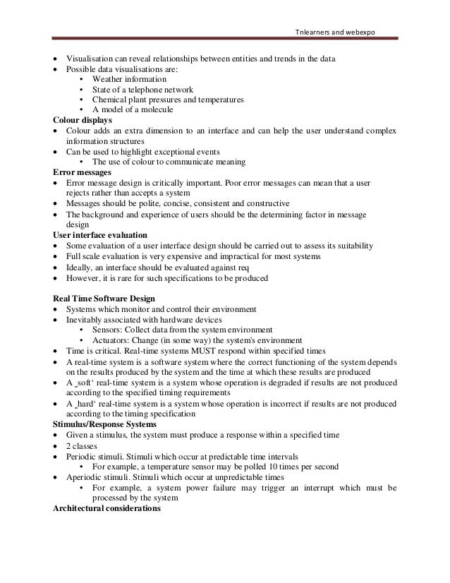 45. 45. Tnlearners and webexpo • Visualisation can reveal relationships between entities and trends in the data • Possible data visualisations are: • Weather information • State of a telephone network • Chemical plant pressures and temperatures • A model of a molecule Colour displays • Colour adds an extra dimension to an interface and can help the user understand complex information structures • Can be used to highlight exceptional events • The use of colour to communicate meaning Error messages • Error message design is critically important. Poor error messages can mean that a user rejects rather than accepts a system • Messages should be polite, concise, consistent and constructive • The background and experience of users should be the determining factor in message design User interface evaluation • Some evaluation of a user interface design should be carried out to assess its suitability • Full scale evaluation is very expensive and impractical for most systems • Ideally, an interface should be evaluated against req • However, it is rare for such specifications to be produced Real Time Software Design • Systems which monitor and control their environment • Inevitably associated with hardware devices • Sensors: Collect data from the system environment • Actuators: Change (in some way) the system's environment • Time is critical. Real-time systems MUST respond within specified times • A real-time system is a software system where the correct functioning of the system depends on the results produced by the system and the time at which these results are produced • A ‗soft‘ real-time system is a system whose operation is degraded if results are not produced according to the specified timing requirements • A ‗hard‘ real-time system is a system whose operation is incorrect if results are not produced according to the timing specification Stimulus/Response Systems • Given a stimulus, the system must produce a response within a specified time • 2 classes • Periodic stimuli. Stimuli which occur at predictable time intervals • For example, a temperature sensor may be polled 10 times per second • Aperiodic stimuli. Stimuli which occur at unpredictable times • For example, a system power failure may trigger an interrupt which must be processed by the system Architectural considerations