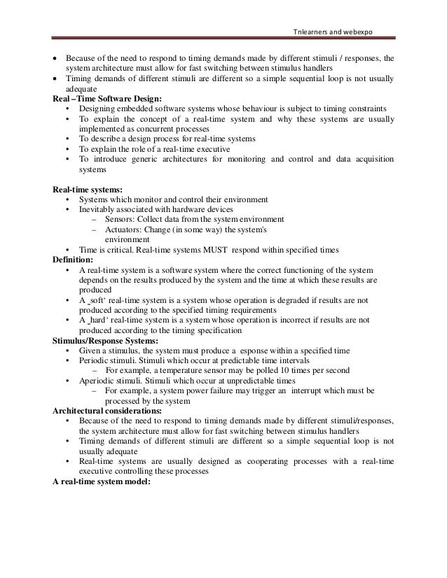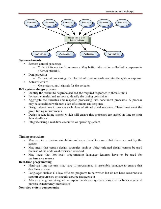 46. 46. Tnlearners and webexpo • Because of the need to respond to timing demands made by different stimuli / responses, the system architecture must allow for fast switching between stimulus handlers • Timing demands of different stimuli are different so a simple sequential loop is not usually adequate Real –Time Software Design: • Designing embedded software systems whose behaviour is subject to timing constraints • To explain the concept of a real-time system and why these systems are usually implemented as concurrent processes • To describe a design process for real-time systems • To explain the role of a real-time executive • To introduce generic architectures for monitoring and control and data acquisition systems Real-time systems: • Systems which monitor and control their environment • Inevitably associated with hardware devices – Sensors: Collect data from the system environment – Actuators: Change (in some way) the system's environment • Time is critical. Real-time systems MUST respond within specified times Definition: • A real-time system is a software system where the correct functioning of the system depends on the results produced by the system and the time at which these results are produced • A ‗soft‘ real-time system is a system whose operation is degraded if results are not produced according to the specified timing requirements • A ‗hard‘ real-time system is a system whose operation is incorrect if results are not produced according to the timing specification Stimulus/Response Systems: • Given a stimulus, the system must produce a esponse within a specified time • Periodic stimuli. Stimuli which occur at predictable time intervals – For example, a temperature sensor may be polled 10 times per second • Aperiodic stimuli. Stimuli which occur at unpredictable times – For example, a system power failure may trigger an interrupt which must be processed by the system Architectural considerations: • Because of the need to respond to timing demands made by different stimuli/responses, the system architecture must allow for fast switching between stimulus handlers • Timing demands of different stimuli are different so a simple sequential loop is not usually adequate • Real-time systems are usually designed as cooperating processes with a real-time executive controlling these processes A real-time system model: