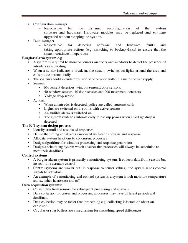 48. 48. Tnlearners and webexpo • Configuration manager – Responsible for the dynamic reconfiguration of the system software and hardware. Hardware modules may be replaced and software upgraded without stopping the systems • Fault manager – Responsible for detecting software and hardware faults and taking appropriate actions (e.g. switching to backup disks) to ensure that the system continues in operation Burglar alarm system e.g • A system is required to monitor sensors on doors and windows to detect the presence of intruders in a building • When a sensor indicates a break-in, the system switches on lights around the area and calls police automatically • The system should include provision for operation without a mains power supply • Sensors • Movement detectors, window sensors, door sensors. • 50 window sensors, 30 door sensors and 200 movement detectors • Voltage drop sensor • Actions • When an intruder is detected, police are called automatically. • Lights are switched on in rooms with active sensors. • An audible alarm is switched on. • The system switches automatically to backup power when a voltage drop is detected. The R-T system design process: • Identify stimuli and associated responses • Define the timing constraints associated with each stimulus and response • Allocate system functions to concurrent processes • Design algorithms for stimulus processing and response generation • Design a scheduling system which ensures that processes will always be scheduled to meet their deadlines Control systems: • A burglar alarm system is primarily a monitoring system. It collects data from sensors but no real-time actuator control • Control systems are similar but, in response to sensor values, the system sends control signals to actuators • An example of a monitoring and control system is a system which monitors temperature and switches heaters on and off Data acquisition systems: • Collect data from sensors for subsequent processing and analysis. • Data collection processes and processing processes may have different periods and deadlines. • Data collection may be faster than processing e.g. collecting information about an explosion. • Circular or ring buffers are a mechanism for smoothing speed differences.