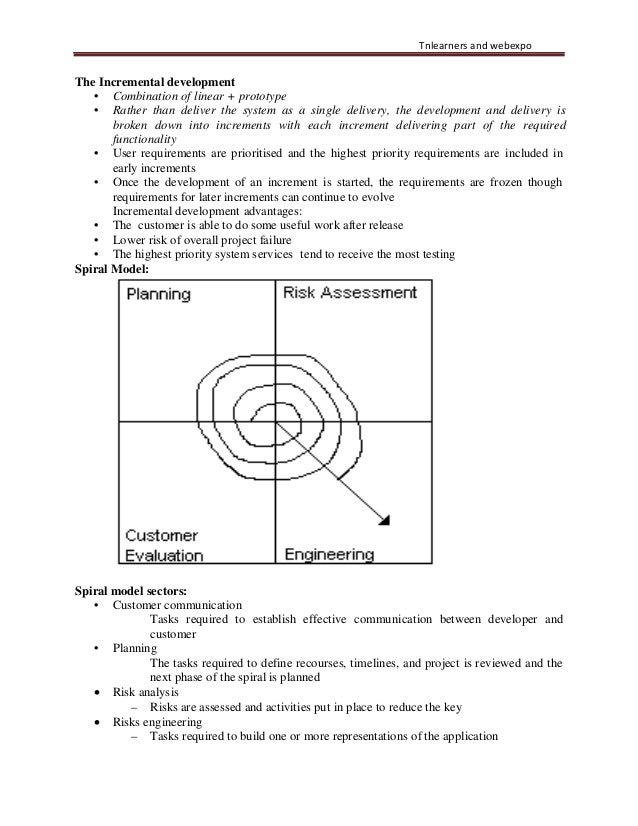 5. 5. Tnlearners and webexpo The Incremental development • Combination of linear + prototype • Rather than deliver the system as a single delivery, the development and delivery is broken down into increments with each increment delivering part of the required functionality • User requirements are prioritised and the highest priority requirements are included in early increments • Once the development of an increment is started, the requirements are frozen though requirements for later increments can continue to evolve Incremental development advantages: • The customer is able to do some useful work after release • Lower risk of overall project failure • The highest priority system services tend to receive the most testing Spiral Model: Spiral model sectors: • Customer communication Tasks required to establish effective communication between developer and customer • Planning The tasks required to define recourses, timelines, and project is reviewed and the next phase of the spiral is planned • Risk analysis – Risks are assessed and activities put in place to reduce the key • Risks engineering – Tasks required to build one or more representations of the application