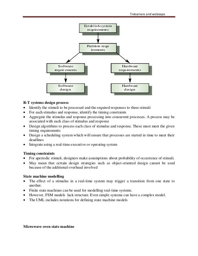 51. 51. Tnlearners and webexpo Establishsystem requirements Partition requ irements Software requir ements Hardware requirements Software design Hardware design R-T systems design process • Identify the stimuli to be processed and the required responses to these stimuli • For each stimulus and response, identify the timing constraints • Aggregate the stimulus and response processing into concurrent processes. A process may be associated with each class of stimulus and response • Design algorithms to process each class of stimulus and response. These must meet the given timing requirements • Design a scheduling system which will ensure that processes are started in time to meet their deadlines • Integrate using a real-time executive or operating system Timing constraints • For aperiodic stimuli, designers make assumptions about probability of occurrence of stimuli. • May mean that certain design strategies such as object-oriented design cannot be used because of the additional overhead involved State machine modelling • The effect of a stimulus in a real-time system may trigger a transition from one state to another. • Finite state machines can be used for modelling real-time systems. • However, FSM models lack structure. Even simple systems can have a complex model. • The UML includes notations for defining state machine models Microwave oven state machine