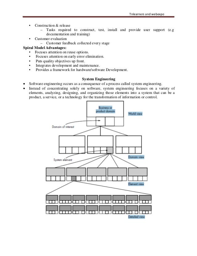6. 6. Tnlearners and webexpo • Construction & release – Tasks required to construct, test, install and provide user support (e.g documentation and training) • Customer evaluation – Customer feedback collected every stage Spiral Model Advantages: • Focuses attention on reuse options. • Focuses attention on early error elimination. • Puts quality objectives up front. • Integrates development and maintenance. • Provides a framework for hardware/software Development. System Engineering • Software engineering occurs as a consequence of a process called system engineering. • Instead of concentrating solely on software, system engineering focuses on a variety of elements, analyzing, designing, and organizing those elements into a system that can be a product, a service, or a technology for the transformation of information or control.