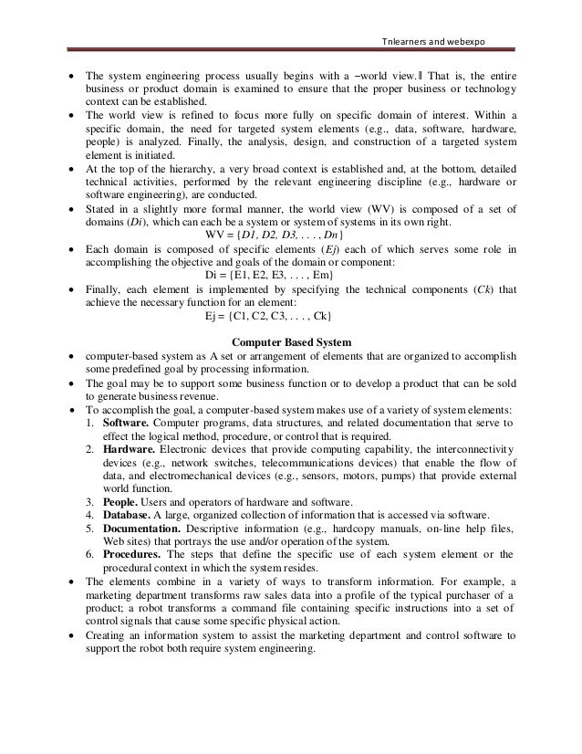 7. 7. Tnlearners and webexpo • The system engineering process usually begins with a ―world view.‖ That is, the entire business or product domain is examined to ensure that the proper business or technology context can be established. • The world view is refined to focus more fully on specific domain of interest. Within a specific domain, the need for targeted system elements (e.g., data, software, hardware, people) is analyzed. Finally, the analysis, design, and construction of a targeted system element is initiated. • At the top of the hierarchy, a very broad context is established and, at the bottom, detailed technical activities, performed by the relevant engineering discipline (e.g., hardware or software engineering), are conducted. • Stated in a slightly more formal manner, the world view (WV) is composed of a set of domains (Di), which can each be a system or system of systems in its own right. WV = {D1, D2, D3, . . . , Dn} • Each domain is composed of specific elements (Ej) each of which serves some role in accomplishing the objective and goals of the domain or component: Di = {E1, E2, E3, . . . , Em} • Finally, each element is implemented by specifying the technical components (Ck) that achieve the necessary function for an element: Ej = {C1, C2, C3, . . . , Ck} Computer Based System • computer-based system as A set or arrangement of elements that are organized to accomplish some predefined goal by processing information. • The goal may be to support some business function or to develop a product that can be sold to generate business revenue. • To accomplish the goal, a computer-based system makes use of a variety of system elements: 1. Software. Computer programs, data structures, and related documentation that serve to effect the logical method, procedure, or control that is required. 2. Hardware. Electronic devices that provide computing capability, the interconnectivity devices (e.g., network switches, telecommunications devices) that enable the flow of data, and electromechanical devices (e.g., sensors, motors, pumps) that provide external world function. 3. People. Users and operators of hardware and software. 4. Database. A large, organized collection of information that is accessed via software. 5. Documentation. Descriptive information (e.g., hardcopy manuals, on-line help files, Web sites) that portrays the use and/or operation of the system. 6. Procedures. The steps that define the specific use of each system element or the procedural context in which the system resides. • The elements combine in a variety of ways to transform information. For example, a marketing department transforms raw sales data into a profile of the typical purchaser of a product; a robot transforms a command file containing specific instructions into a set of control signals that cause some specific physical action. • Creating an information system to assist the marketing department and control software to support the robot both require system engineering.