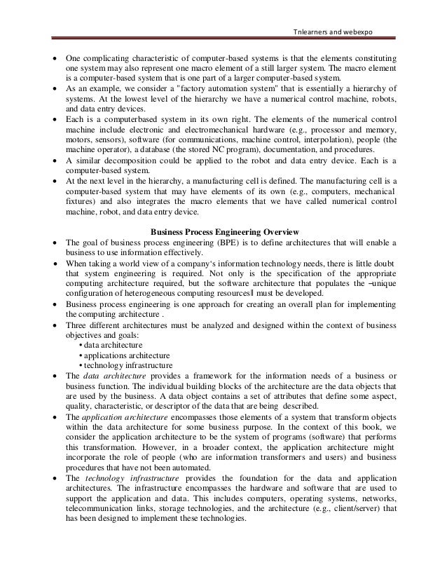 8. 8. Tnlearners and webexpo • One complicating characteristic of computer-based systems is that the elements constituting one system may also represent one macro element of a still larger system. The macro element is a computer-based system that is one part of a larger computer-based system. • As an example, we consider a "factory automation system" that is essentially a hierarchy of systems. At the lowest level of the hierarchy we have a numerical control machine, robots, and data entry devices. • Each is a computerbased system in its own right. The elements of the numerical control machine include electronic and electromechanical hardware (e.g., processor and memory, motors, sensors), software (for communications, machine control, interpolation), people (the machine operator), a database (the stored NC program), documentation, and procedures. • A similar decomposition could be applied to the robot and data entry device. Each is a computer-based system. • At the next level in the hierarchy, a manufacturing cell is defined. The manufacturing cell is a computer-based system that may have elements of its own (e.g., computers, mechanical fixtures) and also integrates the macro elements that we have called numerical control machine, robot, and data entry device. Business Process Engineering Overview • The goal of business process engineering (BPE) is to define architectures that will enable a business to use information effectively. • When taking a world view of a company‘s information technology needs, there is little doubt that system engineering is required. Not only is the specification of the appropriate computing architecture required, but the software architecture that populates the ―unique configuration of heterogeneous computing resources‖ must be developed. • Business process engineering is one approach for creating an overall plan for implementing the computing architecture . • Three different architectures must be analyzed and designed within the context of business objectives and goals: • data architecture • applications architecture • technology infrastructure • The data architecture provides a framework for the information needs of a business or business function. The individual building blocks of the architecture are the data objects that are used by the business. A data object contains a set of attributes that define some aspect, quality, characteristic, or descriptor of the data that are being described. • The application architecture encompasses those elements of a system that transform objects within the data architecture for some business purpose. In the context of this book, we consider the application architecture to be the system of programs (software) that performs this transformation. However, in a broader context, the application architecture might incorporate the role of people (who are information transformers and users) and business procedures that have not been automated. • The technology infrastructure provides the foundation for the data and application architectures. The infrastructure encompasses the hardware and software that are used to support the application and data. This includes computers, operating systems, networks, telecommunication links, storage technologies, and the architecture (e.g., client/server) that has been designed to implement these technologies.