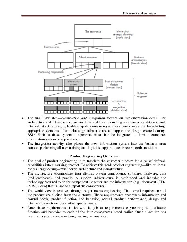 9. 9. Tnlearners and webexpo • The final BPE step—construction and integration focuses on implementation detail. The architecture and infrastructure are implemented by constructing an appropriate database and internal data structures, by building applications using software components, and by selecting appropriate elements of a technology infrastructure to support the design created during BSD. Each of these system components must then be integrated to form a complete information system or application. • The integration activity also places the new information system into the business area context, performing all user training and logistics support to achieve a smooth transition. Product Engineering Overview • The goal of product engineering is to translate the customer‘s desire for a set of defined capabilities into a working product. To achieve this goal, product engineering—like business process engineering—must derive architecture and infrastructure. • The architecture encompasses four distinct system components: software, hardware, data (and databases), and people. A support infrastructure is established and includes the technology required to tie the components together and the information (e.g., documents,CD- ROM, video) that is used to support the components. • The world view is achieved through requirements engineering. The overall requirements of the product are elicited from the customer. These requirements encompass information and control needs, product function and behavior, overall product performance, design and interfacing constraints, and other special needs. • Once these requirements are known, the job of requirements engineering is to allocate function and behavior to each of the four components noted earlier. Once allocation has occurred, system component engineering commences.
