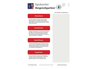 Das Dokument beschreibt verschiedene Kategorien von Gesprächspartnern im Vertrieb, darunter Abzeichner, Entscheider, Beeinflusser und Empfehlungsgeber, sowie deren Eigenschaften und Motivationen. Es betont die Wichtigkeit des Zuhörens und Verstehens der Bedürfnisse der Kunden, anstatt einfach nur Informationen über Produkte zu liefern. Zudem werden Fragen präsentiert, die Verkäufer sich stellen sollten, um effektive Gespräche zu führen und den Entscheidungsprozess des Kunden zu unterstützen.