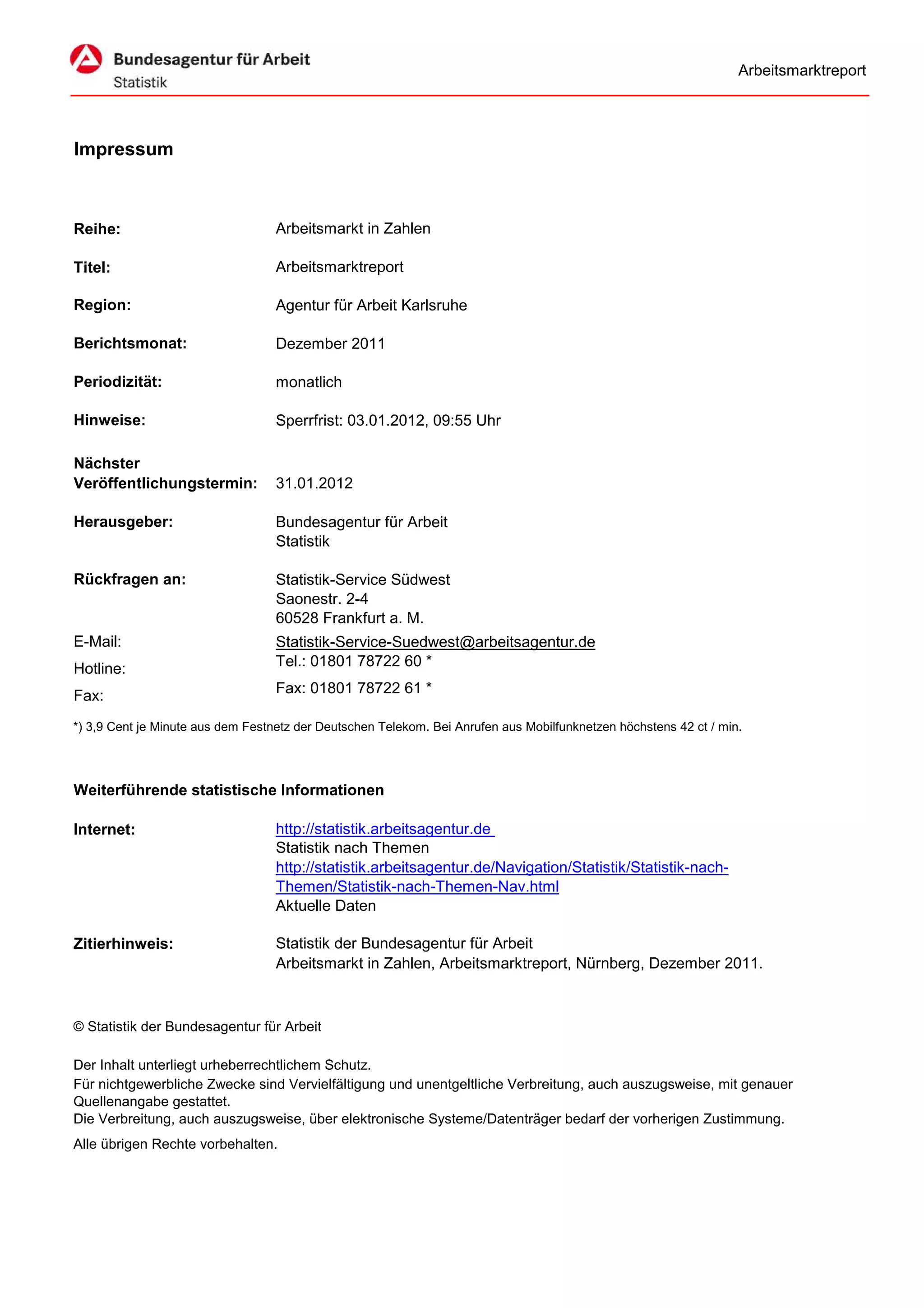 Der Arbeitsmarktreport der Agentur für Arbeit Karlsruhe für Dezember 2011 zeigt, dass die Gesamtzahl der Arbeitsuchenden bei 29.170 liegt, mit einem Anteil von 14.711 Arbeitslosen, was einem Anstieg von 1,5 % gegenüber dem Vormonat entspricht. Die Arbeitslosenquote beträgt 3,9 %, wobei Männer und Frauen jeweils eine ähnliche Quote aufweisen. Der Bericht enthält auch umfassende statistische Daten zu verschiedenen Altersgruppen und Personengruppen im Arbeitsmarkt.