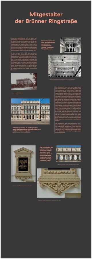 Adolf Loos sen. war ein bedeutender Künstler, der sich auf Grabsteine und Fassadendekoration spezialisiert hat und entscheidend zur Architektur der brünner Ringstraße beitrug. Er und Johann Eduard Tomola schufen die Bauskulpturen für den neuen mährischen Landtag und eine symbolträchtige Schlussstein-Dekoration zur Förderung der Zusammenarbeit zwischen Deutschen und Tschechen. Zudem gestalteten sie bedeutende Kultursäle in Brünn, während die Rivalität zwischen deutschen und tschechischen Einrichtungen durch den Baustil des Besední dům verdeutlicht wurde.