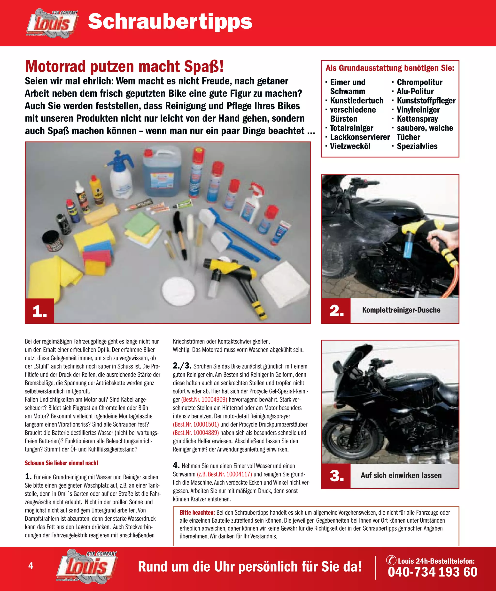 Das Dokument bietet umfassende Tipps zur Pflege und Reinigung von Motorrädern, einschließlich der benötigten Utensilien und der richtigen Vorgehensweise. Dabei wird auf die Bedeutung des Kühlens des Motorrads vor dem Waschen und der sorgfältigen Anwendung von Reinigungs- und Pflegeprodukten hingewiesen. Eine regelmäßige Kontrolle der technischen Teile während der Pflege wird empfohlen, um die Sicherheit und das Erscheinungsbild des Fahrzeugs zu gewährleisten.