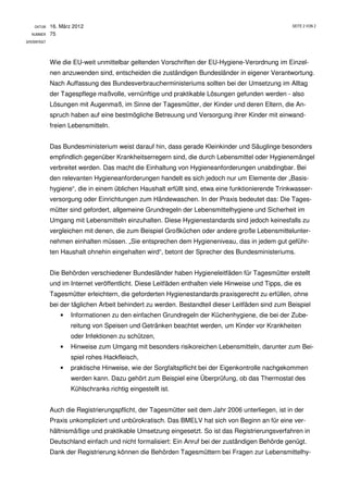 Das Bundesverbraucherministerium fordert die Länderbehörden auf, die Auflagen für Tagesmütter auf ein notwendiges Minimum zu reduzieren und überzogene Hygiene-Kontrollen zu vermeiden. Es wird betont, dass die Hygieneanforderungen, die für Lebensmittelunternehmer gelten, für Tagesmütter nicht praktikabel sind und stattdessen grundlegende Hygieneregeln ausreichend sind. Ziel ist eine vernünftige Umsetzung der Lebensmittelhygiene, die den Bedürfnissen von Tagesmüttern und deren betreuten Kindern gerecht wird.