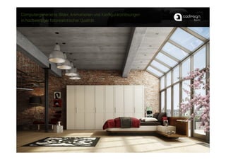 Der Vortrag vom 8. Februar 2012 behandelt neue Visualisierungstechniken wie CGI und Renderings, die vor allem in der Möbel- und Küchenbranche verwendet werden, um fotorealistische Produktbilder und Animationen zu erstellen. Es werden Vorteile der digitalen Visualisierung aufgezeigt, darunter Kosten- und Zeitersparnis sowie die Flexibilität in der Gestaltung und Anpassung. Zudem werden moderne Anwendungen wie interaktive Produktkonfiguratoren, Augmented Reality und digitale Verkaufsunterlagen vorgestellt, die die Marketing- und Vertriebsstrategien revolutionieren.