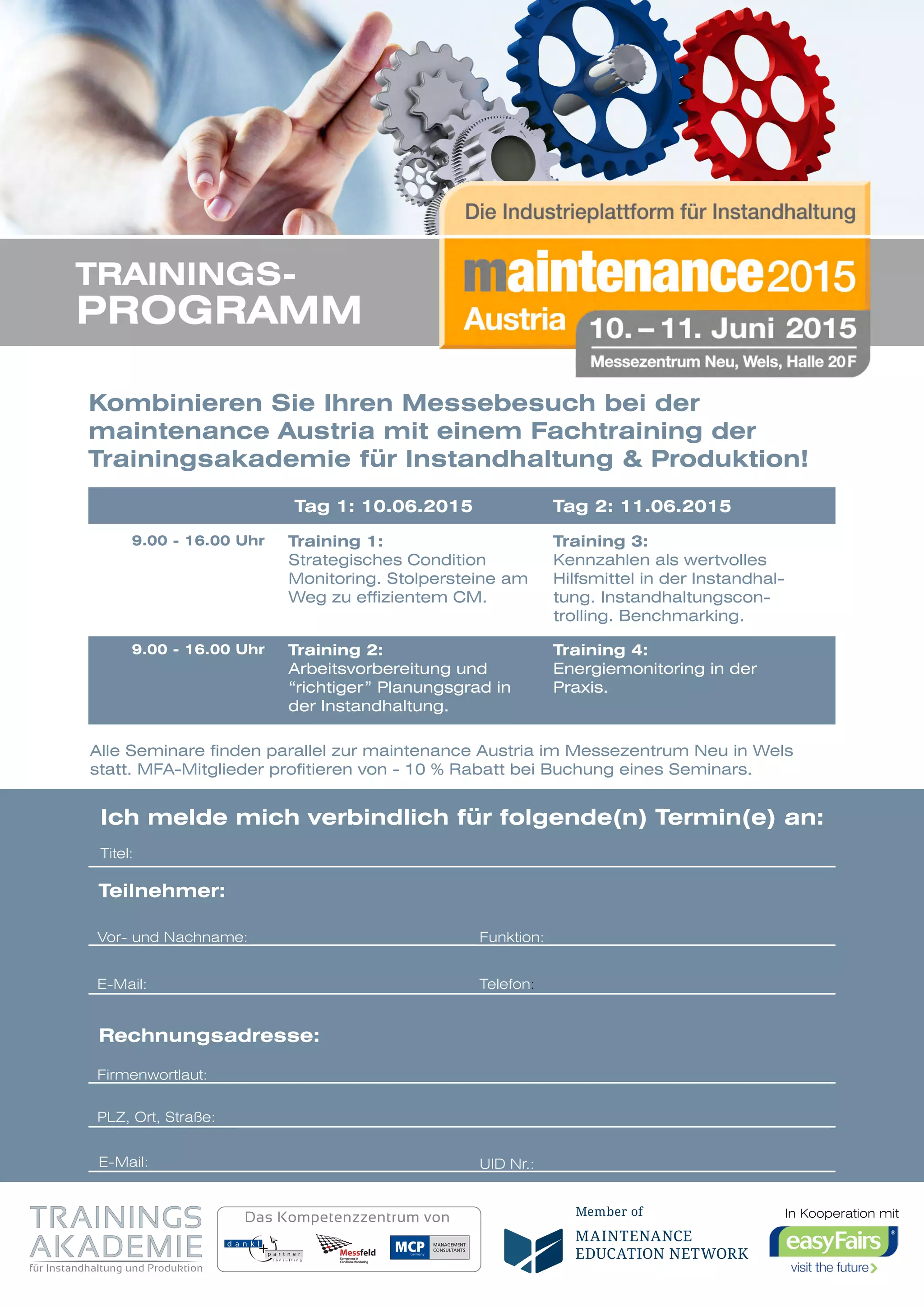 Das Dokument beschreibt ein Fachtraining, das parallel zur Maintenance Austria im Messezentrum Neu in Wels stattfindet, mit verschiedenen Seminaren zu Themen wie Condition Monitoring, Arbeitsvorbereitung und Kennzahlen im Instandhaltungsprozess. Trainings finden am 10. und 11. Juni 2015 statt und kosten jeweils 749 Euro zuzüglich Mehrwertsteuer, mit einem 10% Rabatt für MFA-Mitglieder. Es werden praktische Methoden wie Vorträge, Workshops und Übungen angeboten, um effektive Instandhaltungsstrategien zu vermitteln.