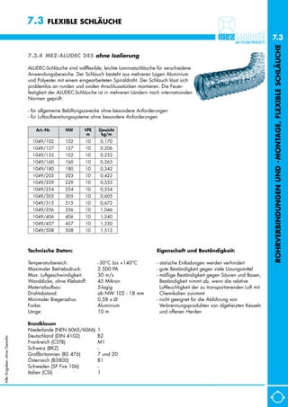 Das Dokument beschreibt flexible Aludec-Schläuche, die leicht und vollflexibel sind, sowie deren Eigenschaften und Anwendungsbereiche insbesondere für allgemeine Belüftungssysteme ohne besondere Anforderungen. Sie sind aus mehreren Lagen Aluminium und Polyester gefertigt, mit einer maximalen Betriebstemperatur von 140°C und einem Druck von 2500 Pa. Der Schlauch ist nach internationalen Normen feuerfest geprüft und nicht für die Ableitung von Verbrennungsprodukten geeignet.