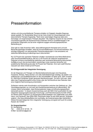 Der neue Bandscheiben-Report der Gmünder Ersatzkasse zeigt, dass Patienten mit Rückenschmerzen ein erhöhtes Risiko für Bandscheibenschäden haben, jedoch oft keine adäquate Behandlung erhalten. Nur 22 Prozent der operierten Patienten nehmen an einer Anschlussheilbehandlung teil, während es signifikante Versorgungslücken sowohl vor als auch nach Krankenhausaufenthalten gibt. Es wird gefordert, die Koordination zwischen den Sektoren zu verbessern und integrierte Versorgungskonzepte zu fördern, um die Behandlungsergebnisse zu optimieren.