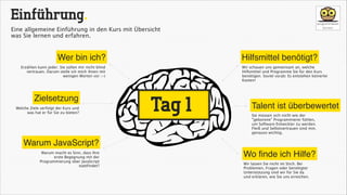Der Kurs 'Programmieren Lernen' ist ein 7-tägiger Grundlagenkurs, der sich auf JavaScript konzentriert und Teilnehmern hilft, erste Erfahrungen in der Softwareentwicklung zu sammeln. Es wird großer Wert auf Lernhilfen und Unterstützung gelegt, um sicherzustellen, dass die Teilnehmer nicht allein gelassen werden und ermutigt werden, trotz anfänglicher Unsicherheiten weiterzumachen. Die Kursziele umfassen die praxisnahe Vermittlung von Programmierkenntnissen sowie die notwendige Ausstattung und Hilfsmittel für einen erfolgreichen Einstieg.
