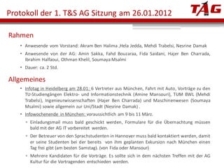 In der Sitzung der T&S AG am 26.01.2012 wurden verschiedene Themen erörtert, darunter das bevorstehende Infowochenende in München und anstehende Veranstaltungen wie Seminare und Firmenbesichtigungen. Das Infocamp in Heidelberg fand am 28.01. statt, mit Vorträgen zu verschiedenen Studiengängen. Weitere Punkte umfassten die Organisation von Nachhilfeangeboten und die Erstellung einer E-Mail-Liste für Studierende.