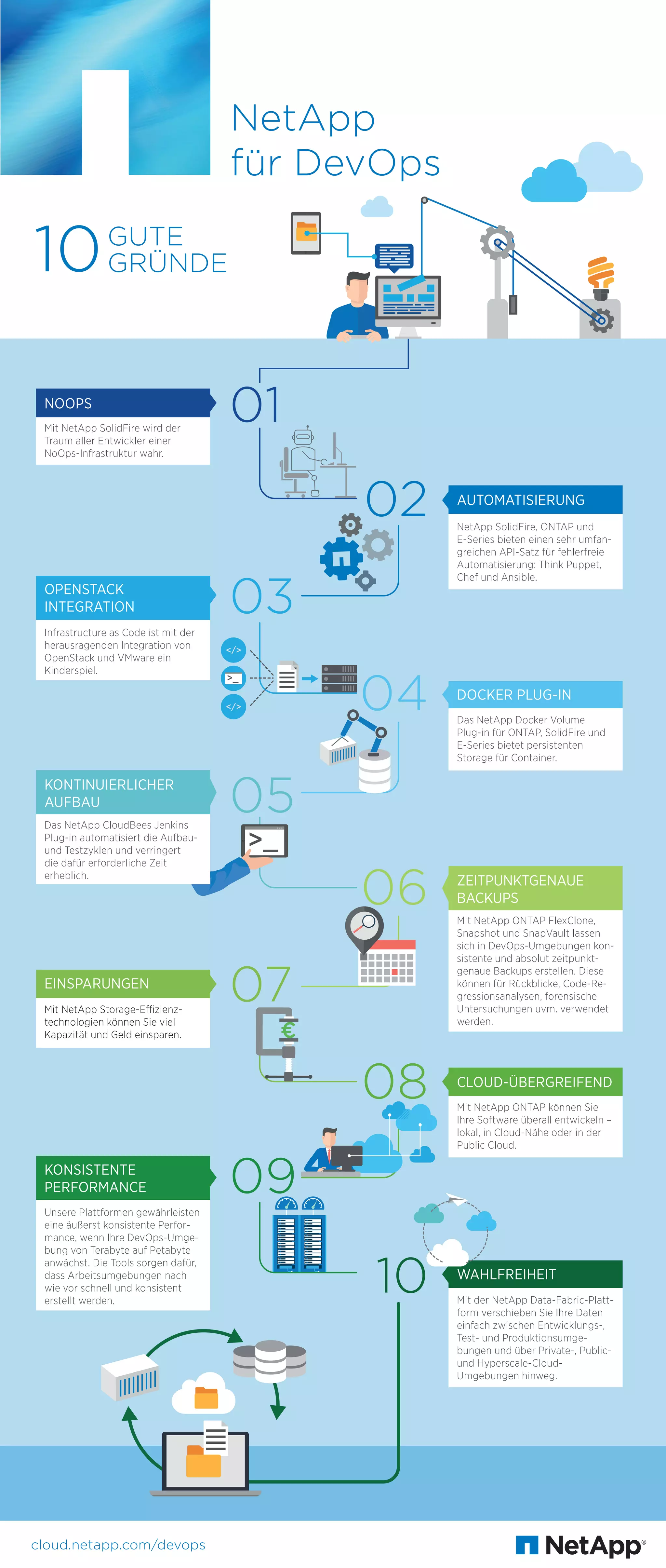 Das Dokument beschreibt, wie NetApp SolidFire Entwicklern eine NoOps-Infrastruktur durch die Integration von OpenStack und VMware bietet, wodurch die Zeit für Aufbau- und Testzyklen erheblich reduziert wird. Mit leistungsstarken Storage-Technologien von NetApp erreichen Nutzer konsistente Performance und können erhebliche Kosteneinsparungen realisieren. Außerdem ermöglicht die NetApp Data Fabric-Plattform eine flexible Handhabung von Daten über verschiedene Umgebungen hinweg, einschließlich lokaler und Cloud-basierter Lösungen.