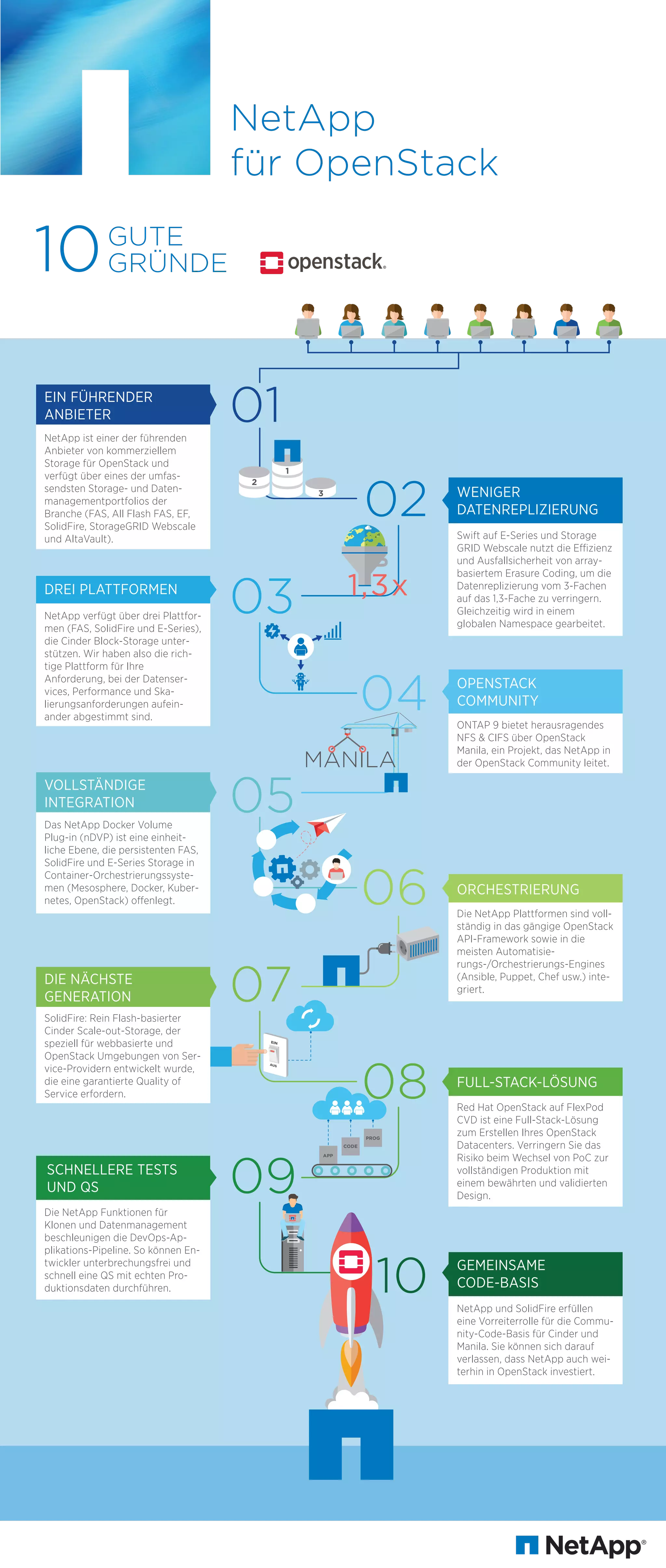 NetApp ist ein führender Anbieter von kommerziellem Storage für OpenStack und bietet ein umfassendes Portfolio, das die Cinder-Block-Speicherung unterstützt. Die Lösungen von NetApp, inklusive das Docker Volume Plug-in und SolidFire, sind auf Performance und Skalierung ausgerichtet und bieten Features wie effiziente Datenreplikation und Integration in gängige Automatisierungs-Frameworks. Darüber hinaus spielt NetApp eine maßgebliche Rolle in der OpenStack-Community und investiert weiterhin in die Weiterentwicklung dieser Technologie.