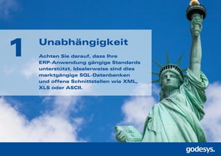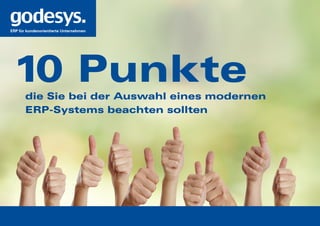 Das Dokument listet zehn wesentliche Punkte auf, die bei der Auswahl eines modernen ERP-Systems zu beachten sind, darunter Unabhängigkeit, Offenheit des Datenmodells und Funktionalität der Software. Es betont die Bedeutung von partnerschaftlichem Verhalten mit dem Anbieter, der Anpassungsfähigkeit der Software und der Transparenz in Bezug auf Kosten. Zudem werden Praktiken wie Wartbarkeit, Erfahrung des Anbieters und die Notwendigkeit regelmäßiger Kommunikation hervorgehoben.