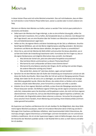 Das Dokument erörtert die Rolle von Weisheit und Mentoring, beginnend mit der mythologischen Beziehung zwischen Athene, Odysseus und Telemachos, und beschreibt, wie Mentoren den Mentees helfen können, durch Reflexion und kognitive Entwicklung weiser zu werden. Es bringt die Theorie von Robert Kegan zur Entwicklung Erwachsener in Verbindung mit dem Mentor-Mentee-Prozess und bietet praktische Ansätze für Mentoren zur Förderung von Einsicht und Identitätsreflexion. Abschließend wird betont, dass der Erfolg einer Mentoringbeziehung nicht nur an der Karriere des Mentees gemessen werden sollte, sondern auch daran, wie viel weiser der Mentee geworden ist.