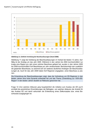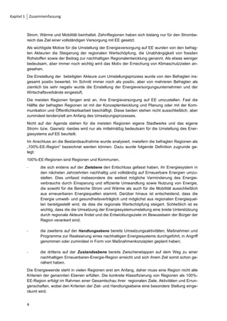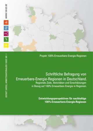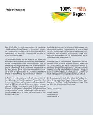 Das Projekt "Entwicklungsperspektiven für nachhaltige 100%-erneuerbare-energie-regionen in Deutschland" zielt darauf ab, regionale Aktivitäten zur vollständigen Versorgung mit erneuerbaren Energien zu dokumentieren, zu analysieren und zu unterstützen. Eine schriftliche Befragung von 82 Regionen und Kommunen hat ergeben, dass 80% entweder einen politischen Beschluss zur Umstellung ihrer Energieversorgung auf erneuerbare Energien gefasst haben oder planen, dies zu tun. Die Ergebnisse zeigen, dass die Umstellung der Energieversorgung vor allem von der Steigerung der regionalen Wertschöpfung und der Unabhängigkeit von fossilen Rohstoffen motiviert wird, wobei die vielen Regionen noch am Anfang des Prozesses stehen.