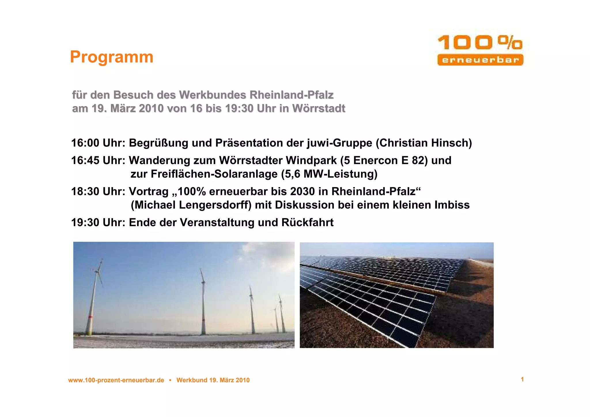 Am 19. März 2010 fand ein Besuch des Werkbundes Rheinland-Pfalz statt, der sich auf das Thema 100% erneuerbare Energien bis 2030 konzentrierte. Der Programmablauf umfasste eine Präsentation, eine Wanderung zu Wind- und Solaranlagen sowie einen Vortrag mit anschließender Diskussion über die Fortschritte und Herausforderungen im Bereich erneuerbare Energien in Rheinland-Pfalz. Die Veranstaltung zielte darauf ab, das Bewusstsein für die Notwendigkeit eines umfassenden Energiewandels zu schärfen und die Region als Vorreiter in der Nutzung erneuerbarer Energien zu positionieren.