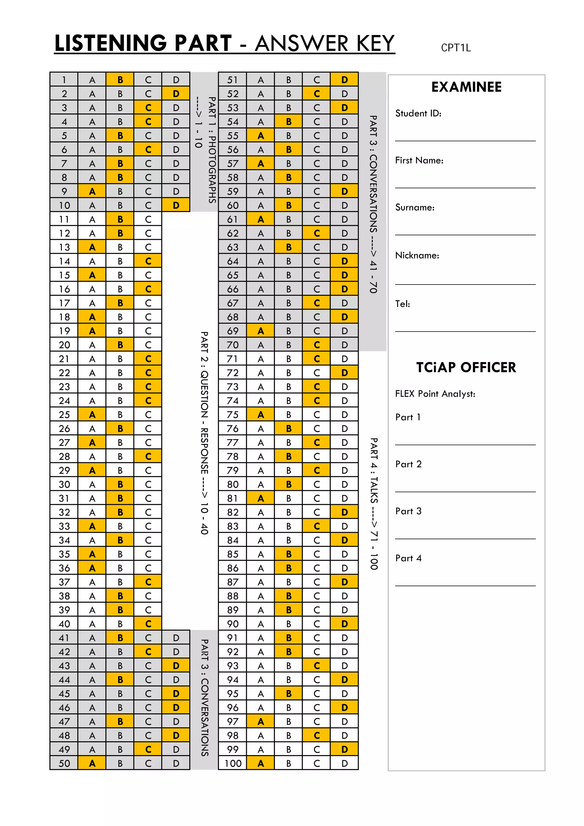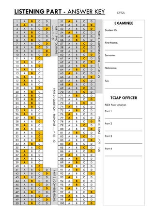 Das Dokument enthält Antwortschlüssel für verschiedene Prüfungsabschnitte, darunter Listening-Teile mit Multiple-Choice-Fragen. Es sind Platzhalter für persönliche Informationen der Prüflinge wie Name, Nachname und Teilnehmernummer vorhanden. Zudem sind die Fragen und Antwortmöglichkeiten nummeriert, und die Struktur des Dokuments weist auf eine wiederkehrende Formatierung hin.