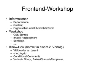 Der Workshop behandelt wesentliche Aspekte der Frontend-Entwicklung, insbesondere Performance, Qualität und Organisation von Webseiten. Es werden Techniken wie CSS Sprites und Bildersubstitution vorgestellt, sowie Werkzeuge wie YSlow und Firebug zur Leistungsbewertung eingesetzt. Die Konformität zu Webstandards und die Zugänglichkeit für Nutzer und Maschinen sind zentrale Themen, begleitet von zahlreichen Checklisten zur Qualitätssicherung.