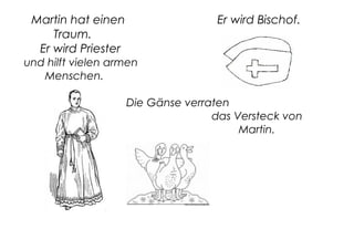 Die Legende von Sankt Martin erzählt, wie der Soldat Martin seinen Mantel und Brot mit einem Bettler teilt. Er wird später Bischof und hilft vielen armen Menschen, wobei sein Versteck von den Gänsen verraten wird. Am 11. November feiern wir Sankt Martin mit einem Laternenumzug und Gänsebraten.